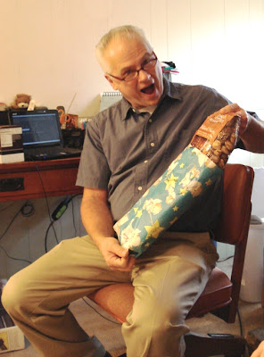 When Bernadette (my mom) opened the lip balms, she tried one on and asked Daniel (my dad) to see if he could smell it, so he kissed her to find out. It was cute. Ed managed to snap a photo, but it came out too blurry. Oh well. They probably didn't want a photo like that on the internet anyway. ;)
